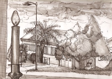 I sketched the whole thing out in pencil first and then went over it in ink, adding details and using pens of various thickness. Richard watched as I put the finishing touches on the hair–which is one of the things I have the most trouble with. As I continued to add more swoops, and curls, and hatch marks, he warned me to stop before I went too far.