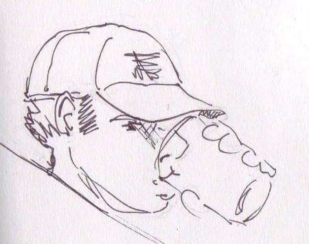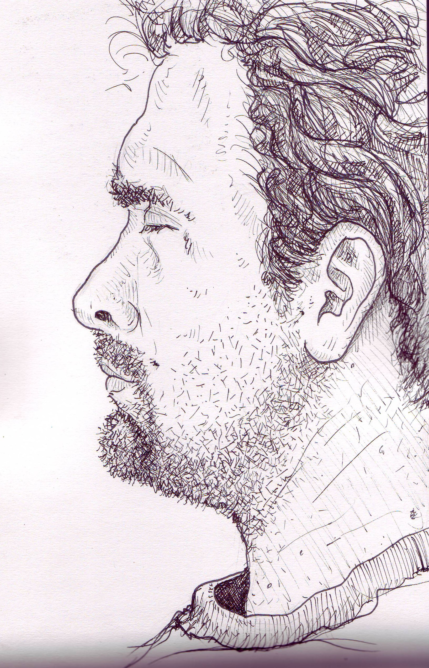 I really struggled with this because drawing it the way I truly saw it made him appear, well, kinda fat. I went back and forth a dozen times, sketching and erasing, sketching and erasing. By drawing it the way I thought it was, it came out looking more like Richard. By drawing what I saw, he came out looking fat. In the end I went with the downward angle version because the whole point of the exercise was to draw what I saw, and dammit that’s what I saw.