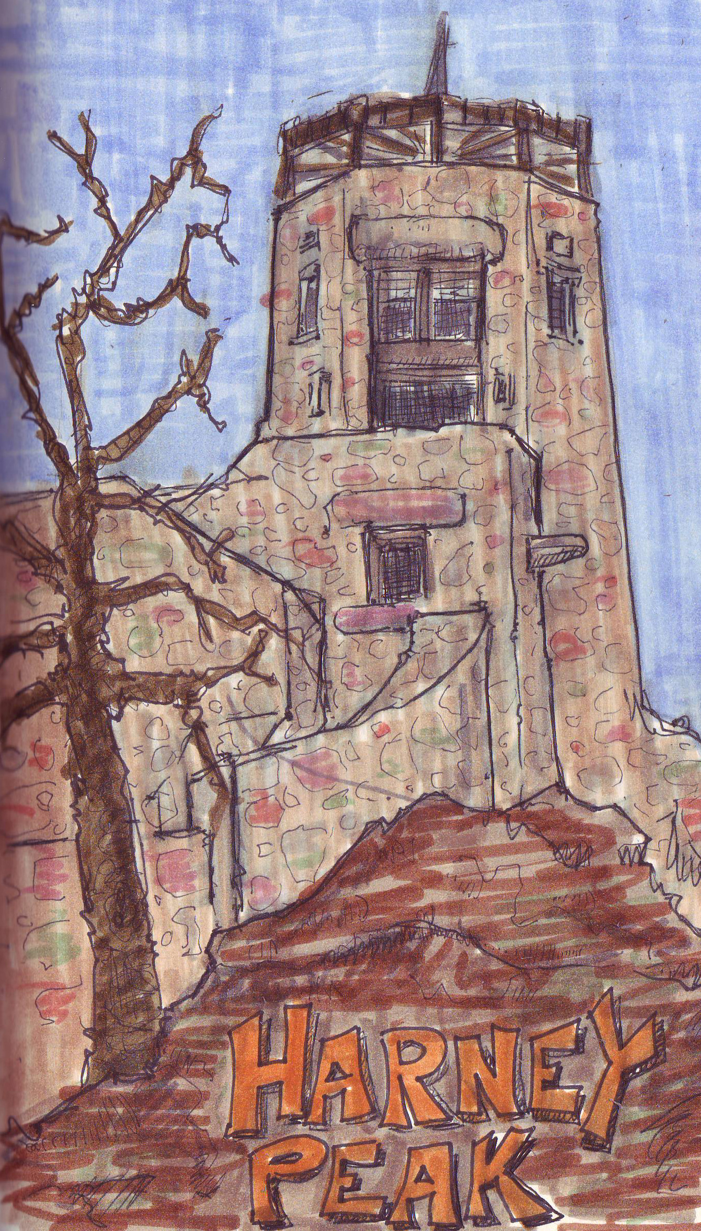 Now we head west to the Black Hills where me and my dad did some hiking and camping. One day I climbed up to Harney Peak, the highest mountain in SoDak, and did this sketch of the tower.