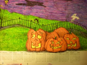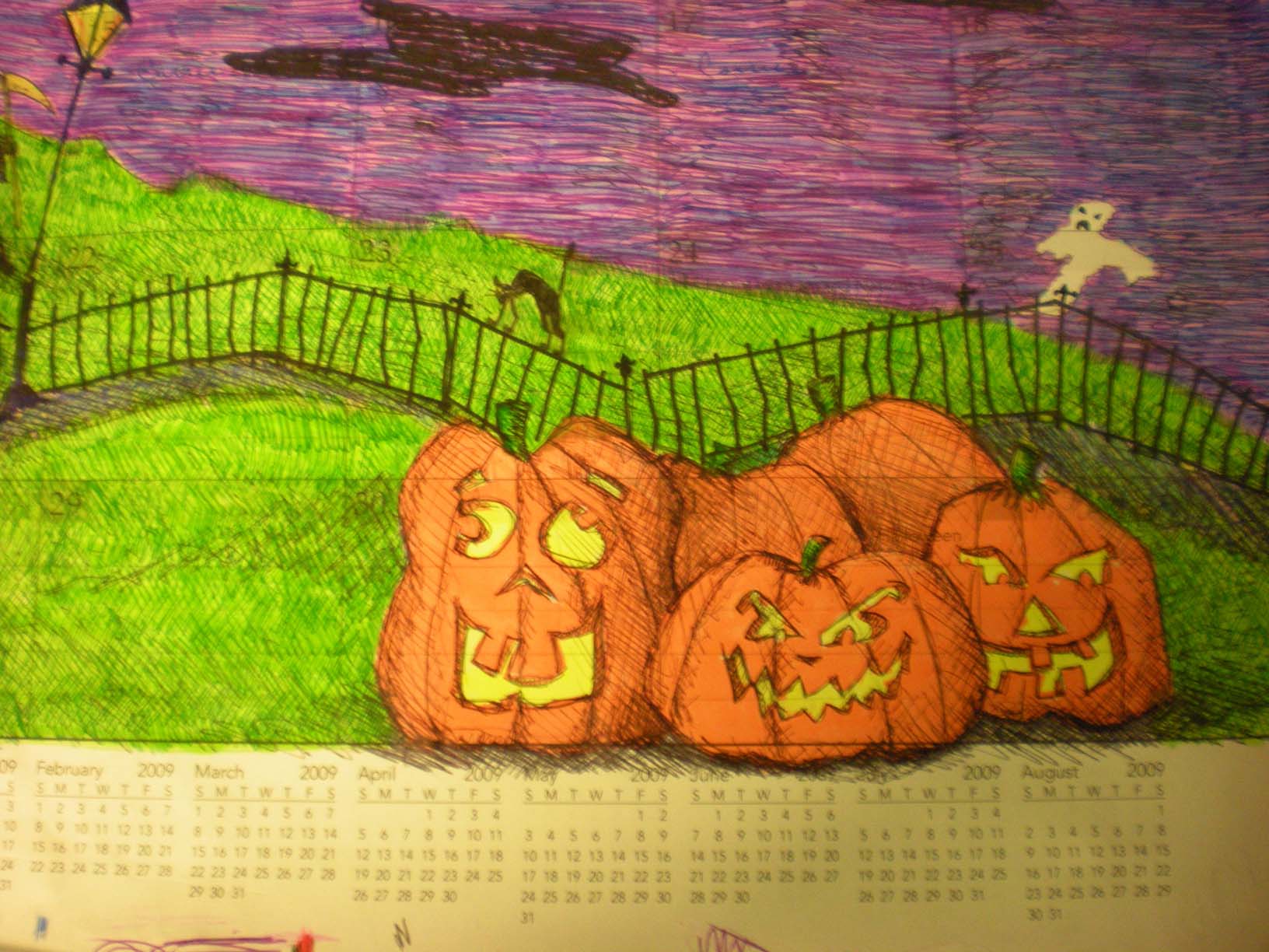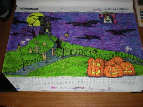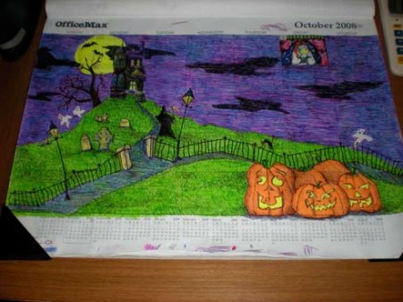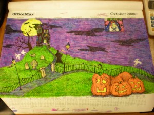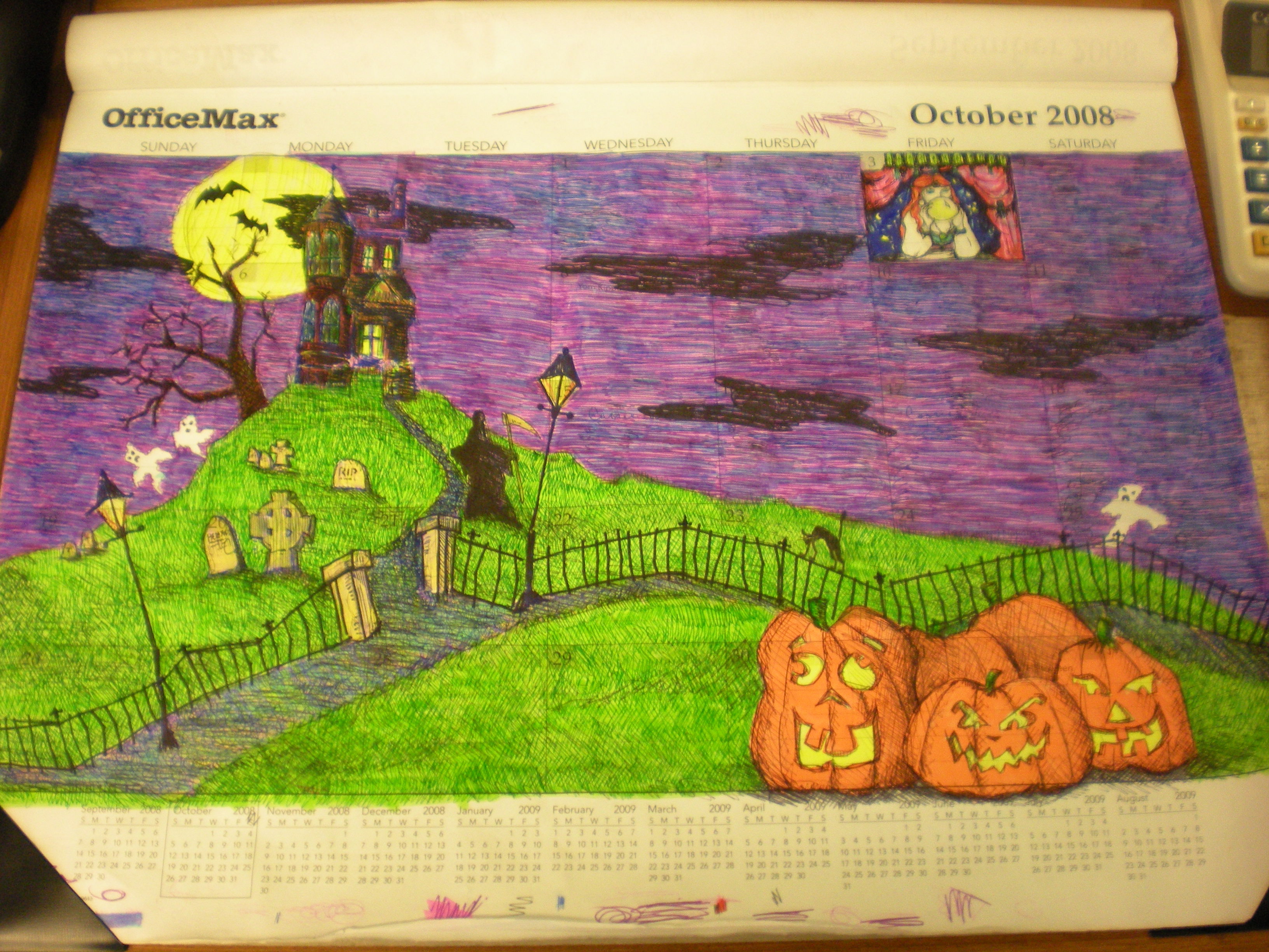 I just came across these old pictures from 2008. When I first started my current job I inherited this ginormous desk calendar, which I never used. (I’m an Outlook Express kind of girl.) So I mostly just scribbled on it and drew random pictures. Until we got to October.