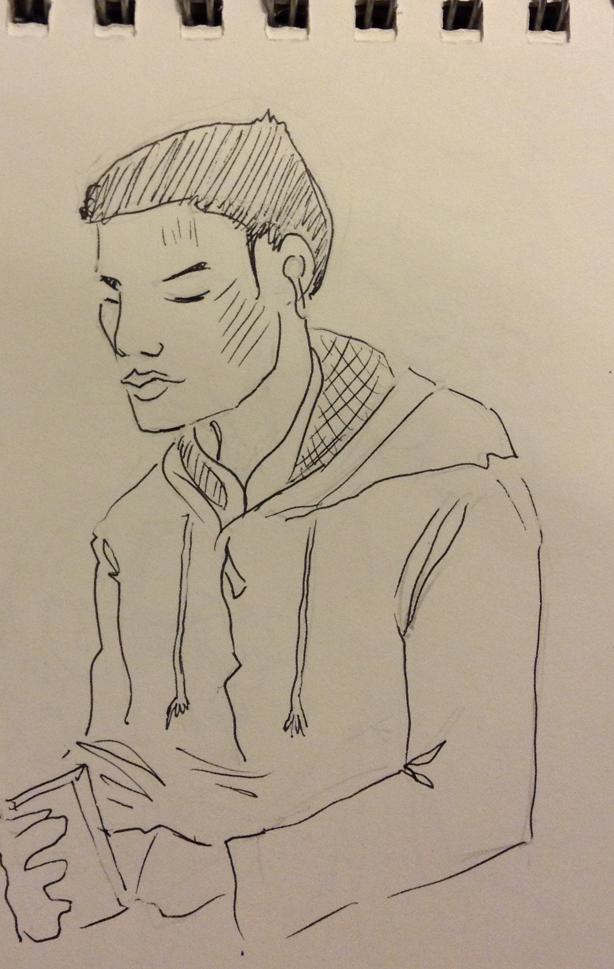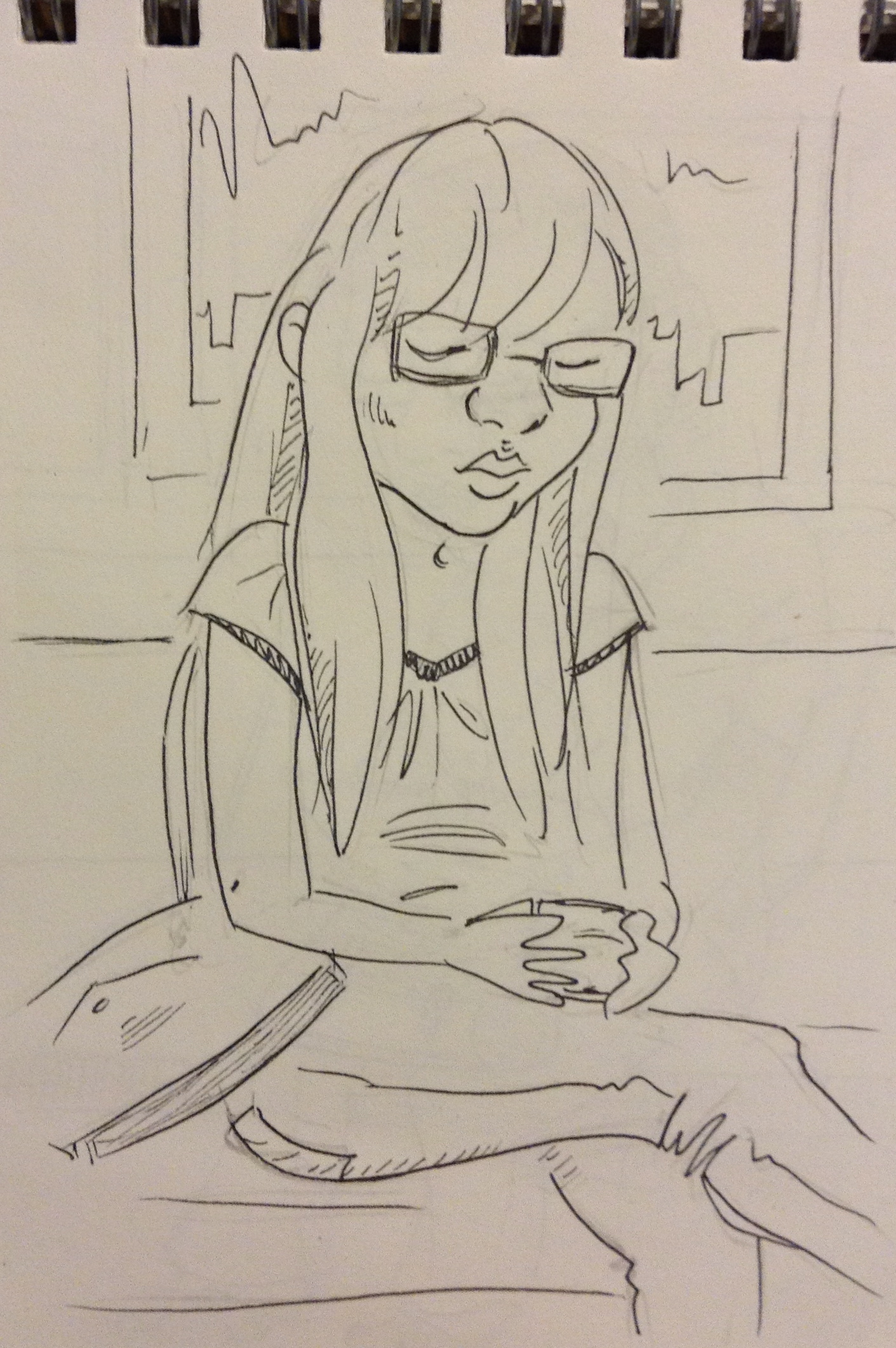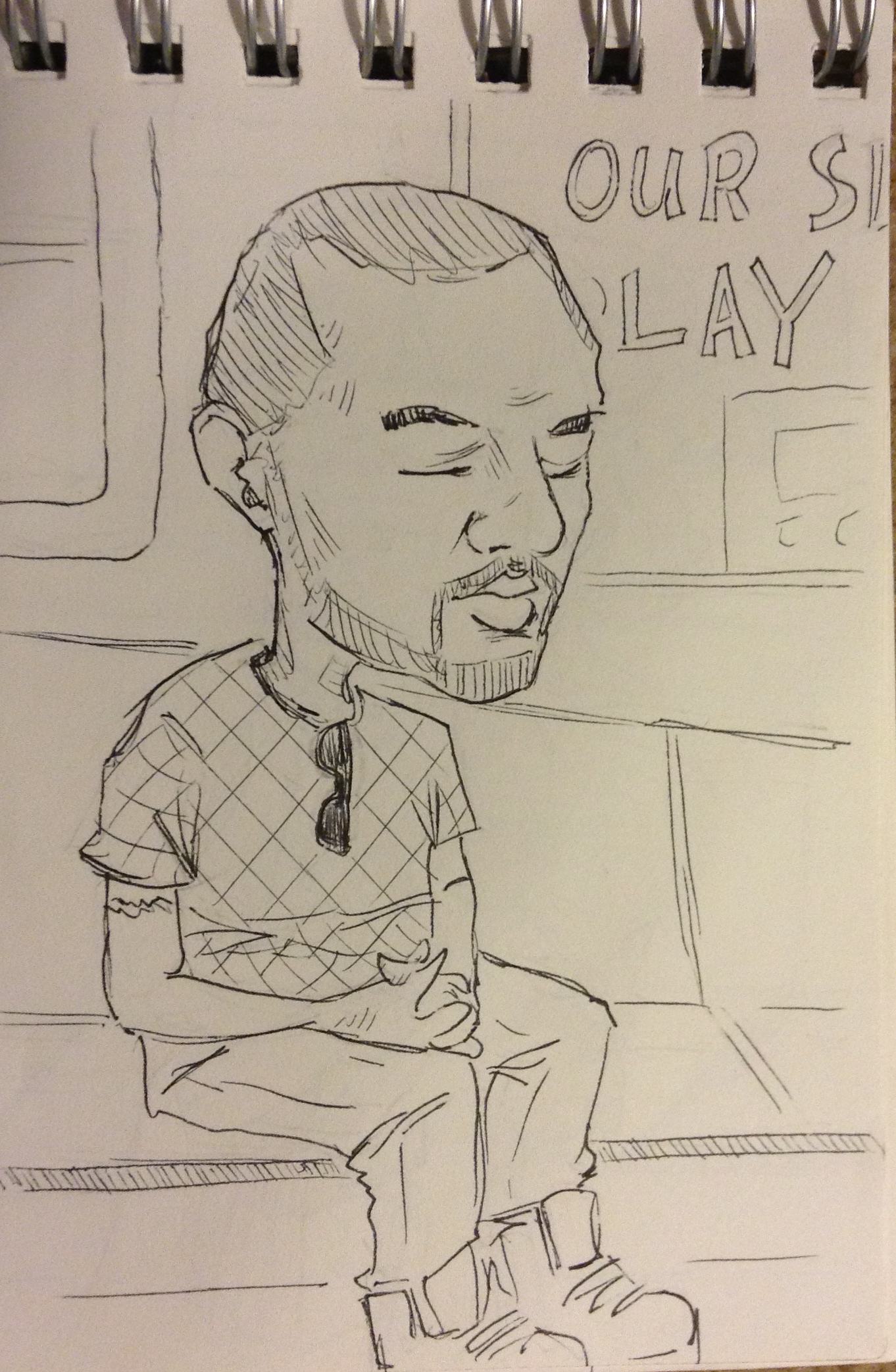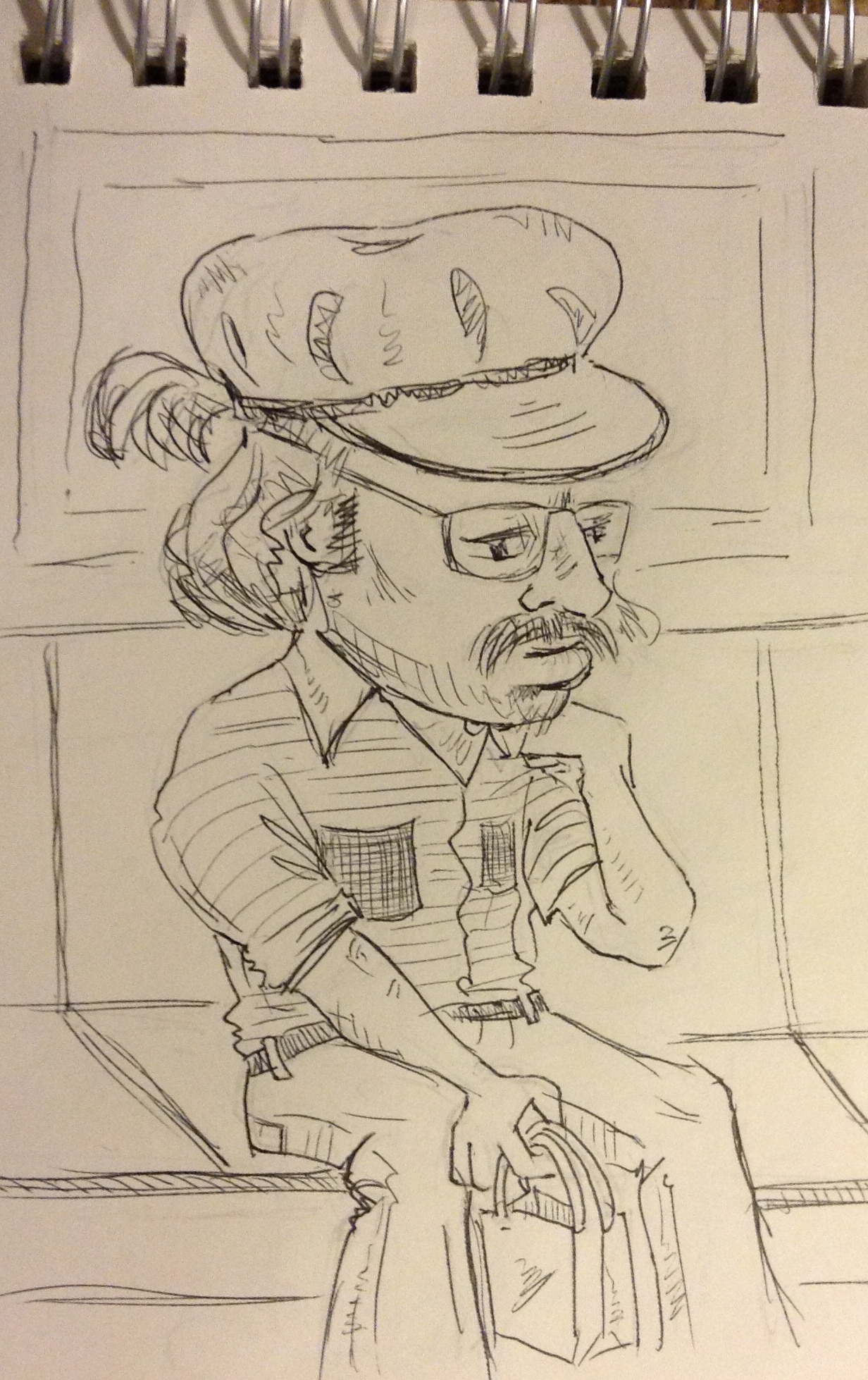The sketches I did on the train started out pretty disappointing. The same old quick gesture sketches I always do in those kind of situations. A quick couple of circles, lines, and squares to lay out the basic shapes, and then whatever details I had time to add before the person (or myself) had to exit the train. Bor-ring.