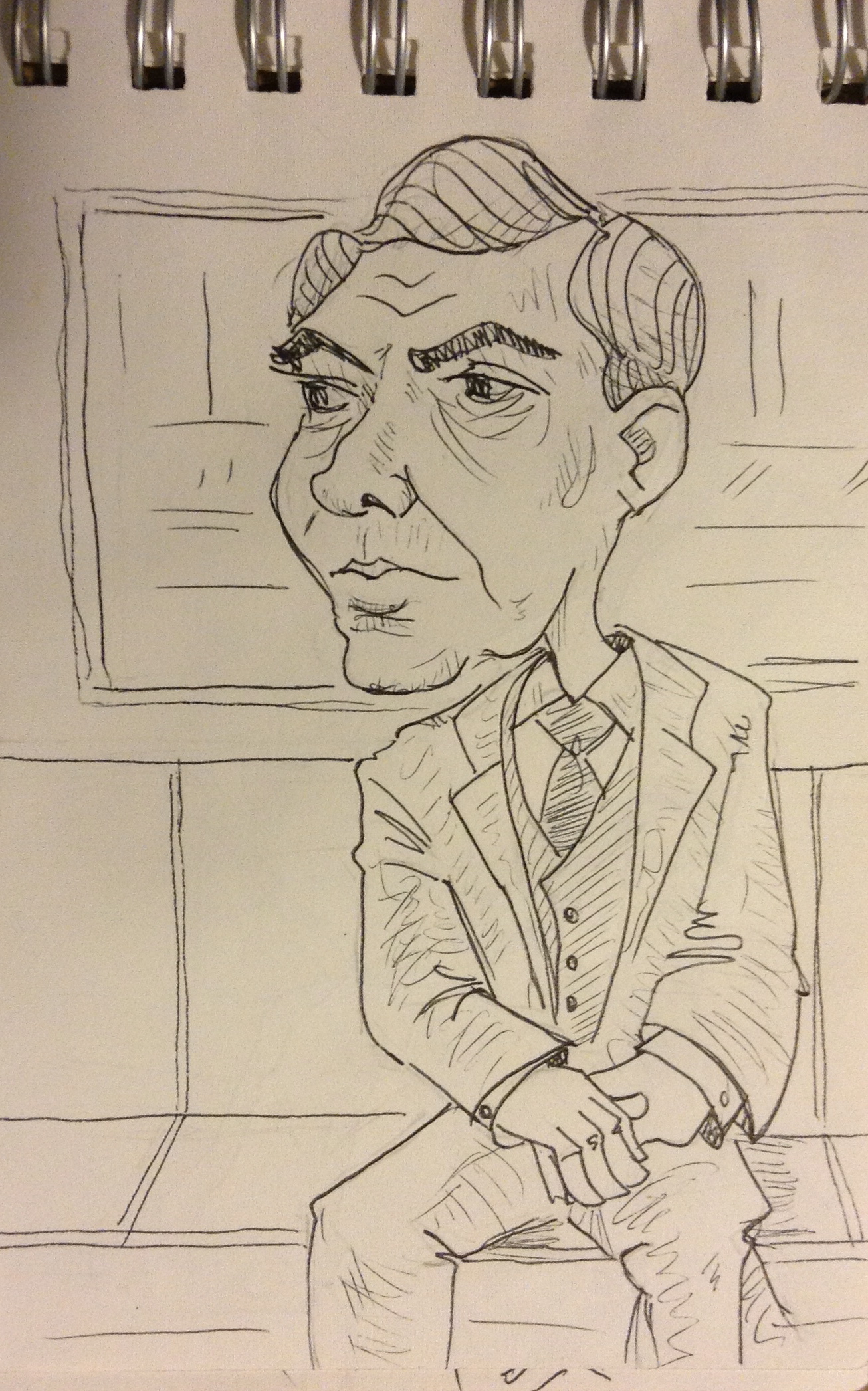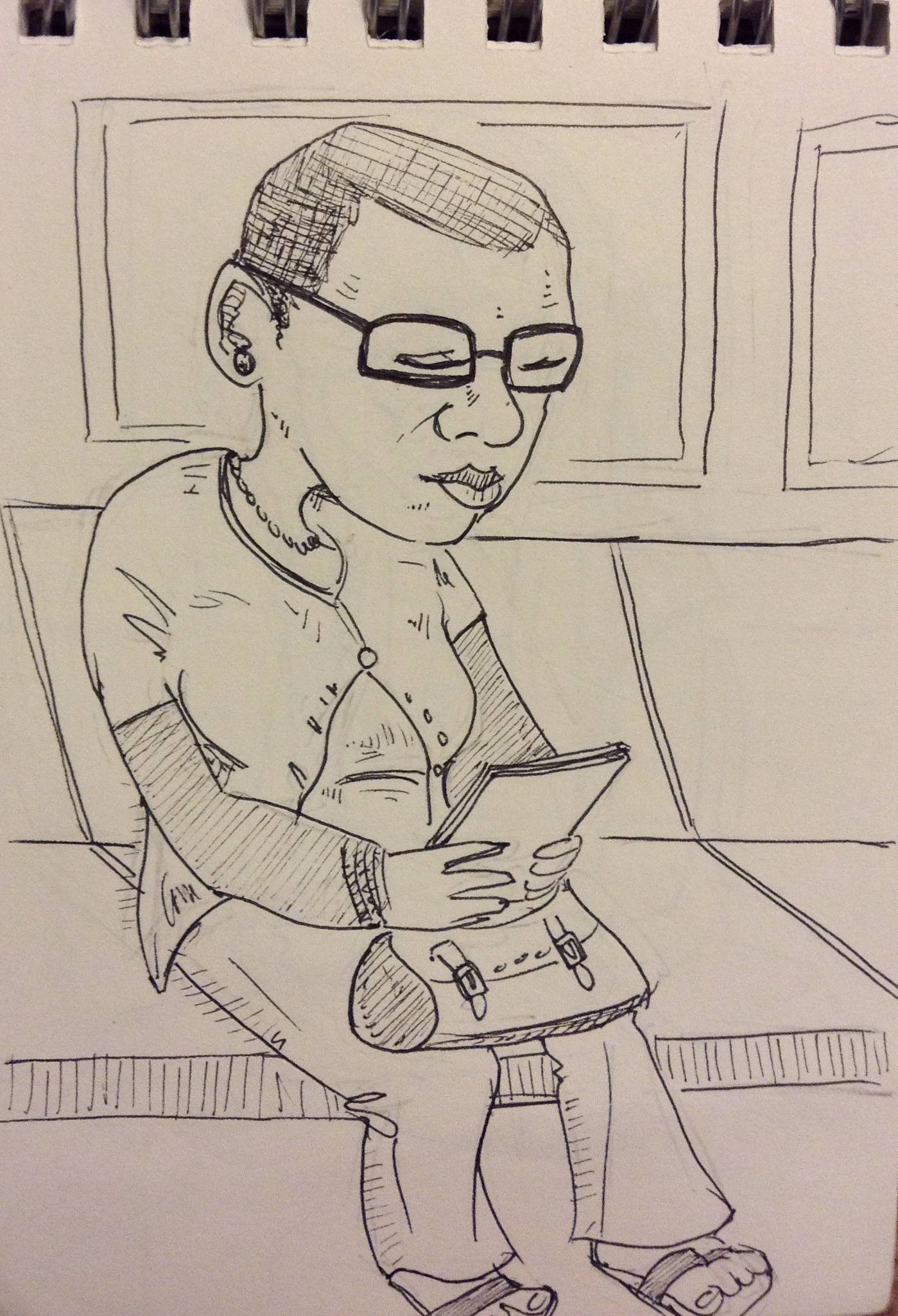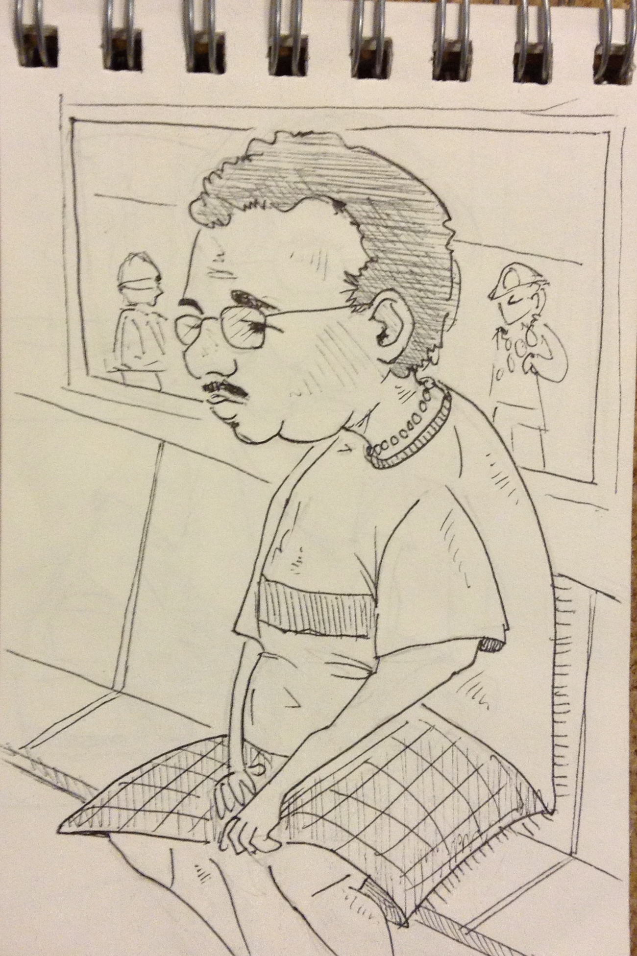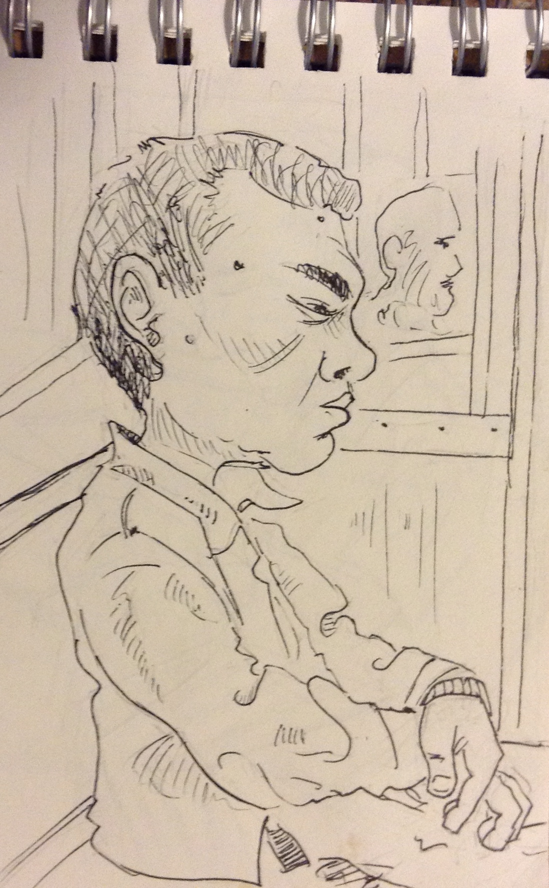 The sketches I did on the train started out pretty disappointing. The same old quick gesture sketches I always do in those kind of situations. A quick couple of circles, lines, and squares to lay out the basic shapes, and then whatever details I had time to add before the person (or myself) had to exit the train. Bor-ring.
