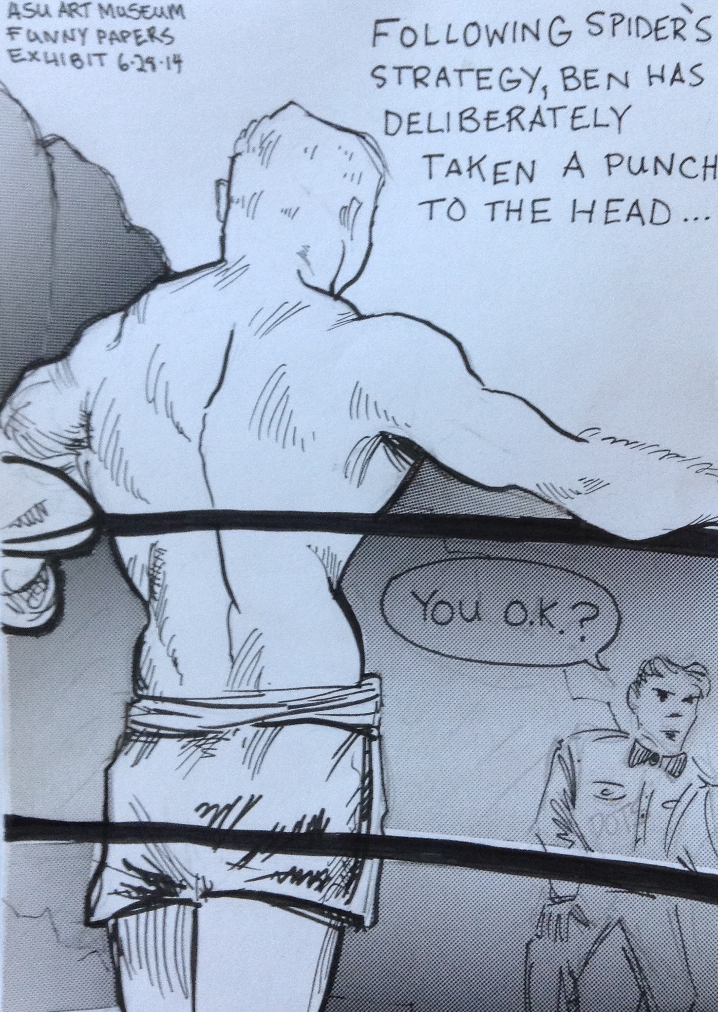 Looking at all the different comics displayed next to each other, I really noticed how much more realistic the figures look in the dramatic strips than they do in the funny ones. There was a panel in one particular strip that I couldn’t stop looking at, because the artist had done a really good job of capturing the posture of a boxer resting against the ropes in a boxing ring between matches.