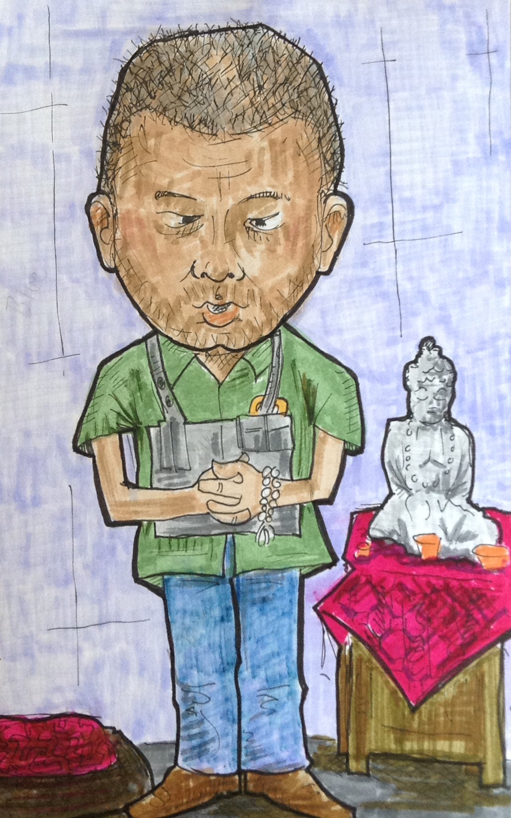 Here is a marker drawing I did of “Bad Buddhist” Dan Hull at his solo performance last June at Space 55. Dan is a stand up comedian, teacher, storyteller, DJ, and a buddhist. And I mean, a real buddhist. Not like that guy in your office who says he’s a buddhist because he learned about it in a world religions class back in college and thought it sounded easy. Dan has dedicated a huge part of his life to his buddhism. He went through training, attended conferences, made his own special robe, and even managed to piss off a hundred year old buddhist master.